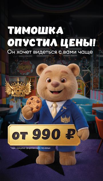 Мы хотим видеться с вами чаще и медвежонок Тимошка придумал как это сделать! С 1 апреля при покупке фирменного печенья "Город Детей" вход на весь день начинается от 990₽